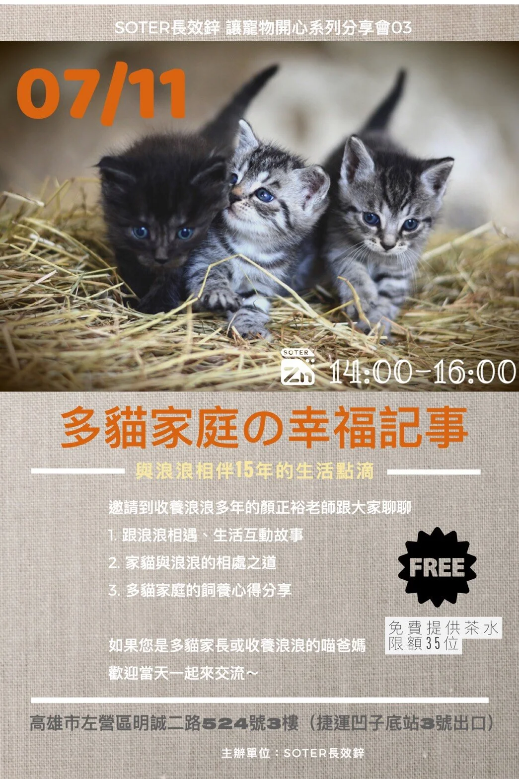 【講座】多貓家庭の幸福記事 Saturday, July 11, 2020 2:00 PM 4:00 PM 14:00 16:00 Google Calendar ICS 【講座】多貓家庭の幸福記事▌主題內容:① 跟浪浪相遇生活互動故事② 家貓與浪浪的相處之道③ 多貓家庭的飼養心得分享(如何清潔與照顧)/ 判斷每隻喵孩的情緒反應▌活動時間:7/11 (六) 下午2點-4點▌報名網址:https://www.surveycake.com/s/Xqd1M