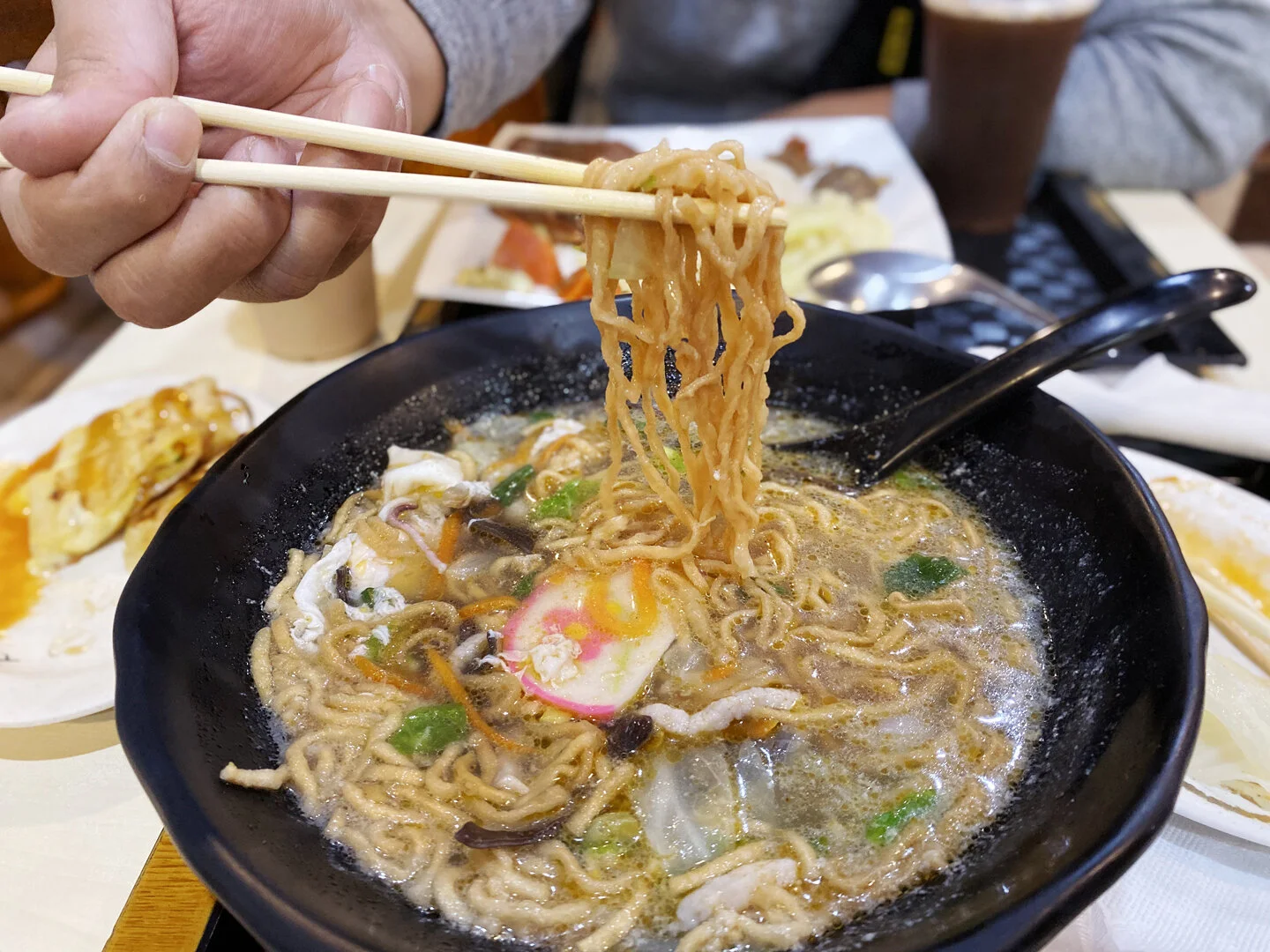 這次特地來點「鍋燒麵」,麵條口感類似泡麵,屬於泡久會爛的麵條,這次點了基本鍋燒麵所以湯頭是清雅的柴魚湯(店內還有其他口味),價位落在親民的70元,整份鍋燒麵內含許多蔬菜有紅蘿蔔絲、木耳、菜絲、蝦仁、肉絲、火鍋料及小卷,基本上整碗很豐富,湯頭清爽!